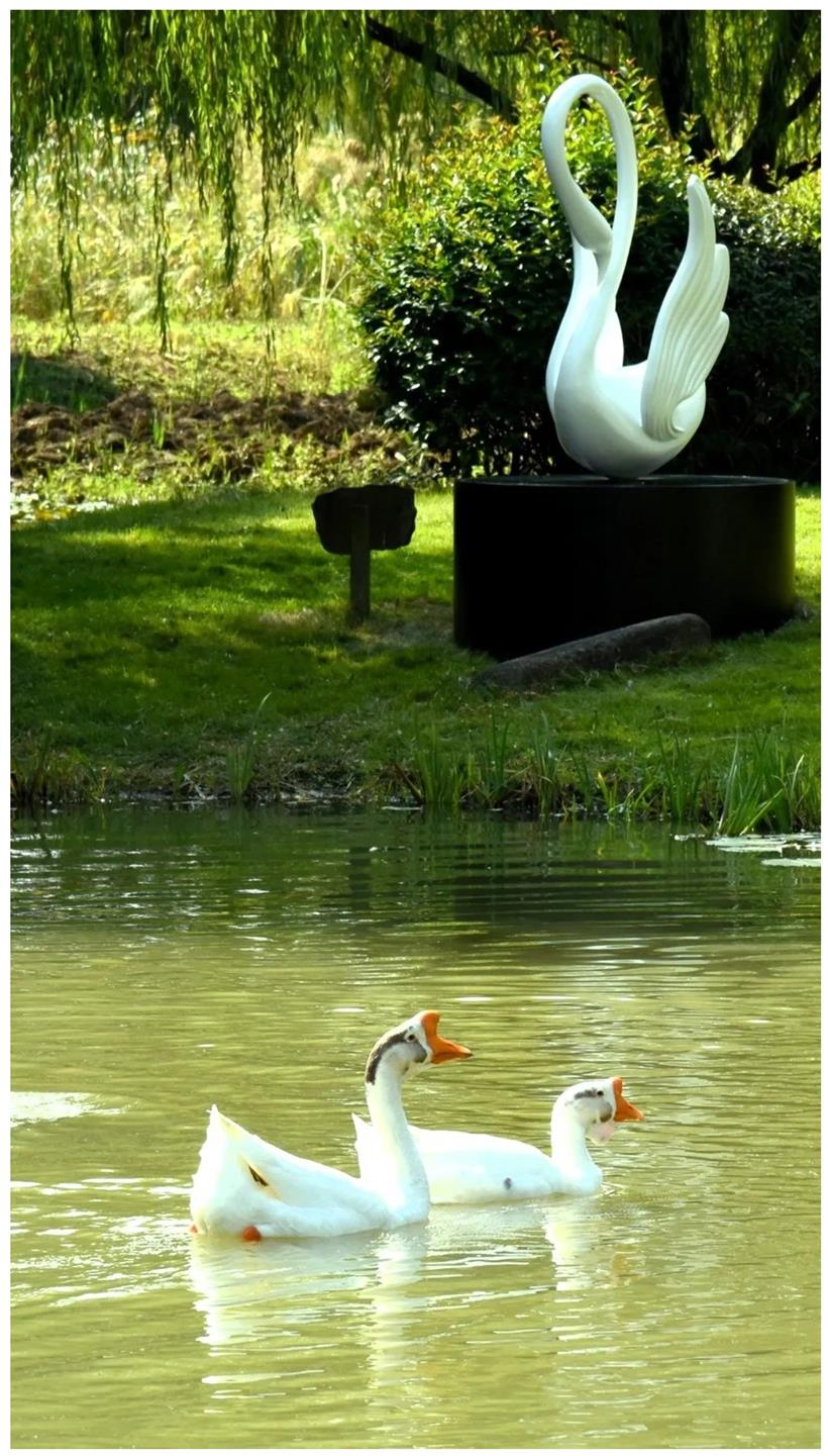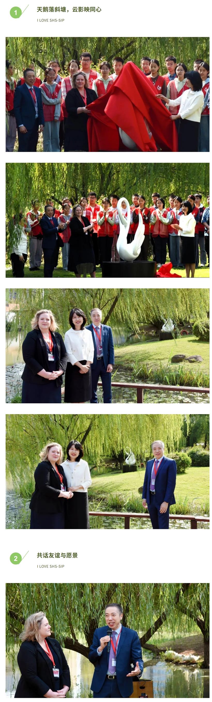 这座由苏州德威外籍人员子女学校&苏州工业园区德闳高级中学赠予的天鹅,静静伫立在湿地之畔,象征着纯洁、高雅与志存高远。它不仅是西马斜塘“云影”的延伸,更承载着两校“同心”的情谊与祝福。