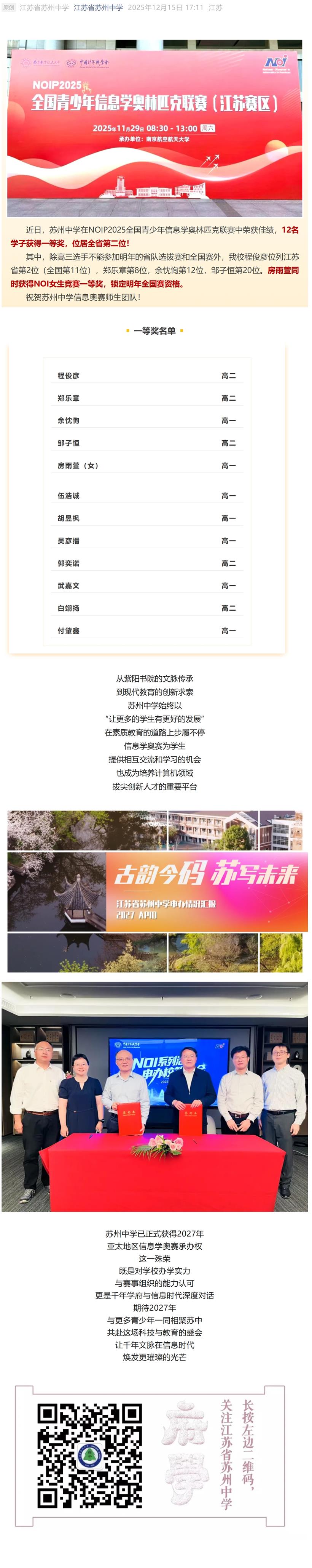 苏州中学12 人荣获 NOIP 一等奖,全省第二!